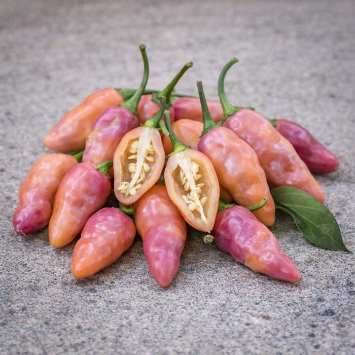Fidalgo Roxa är en chili som brukar få folk att le lite när plantan börjar bära frukt – för den ser nästan ut som om någon hängt små karameller i busken. Frukterna är små, lantern-/ekollonformade och skiftar färg i flera steg: ofta från mörkt lila (ibland nästan svart i rätt ljus) till rosa/peach/salmon-toner när de mognar. Lägg till vit-lila blommor och mörkare stjälkar på vissa plantor, så har du en sort som både är prydnadsvärd och fullt seriös i köket.